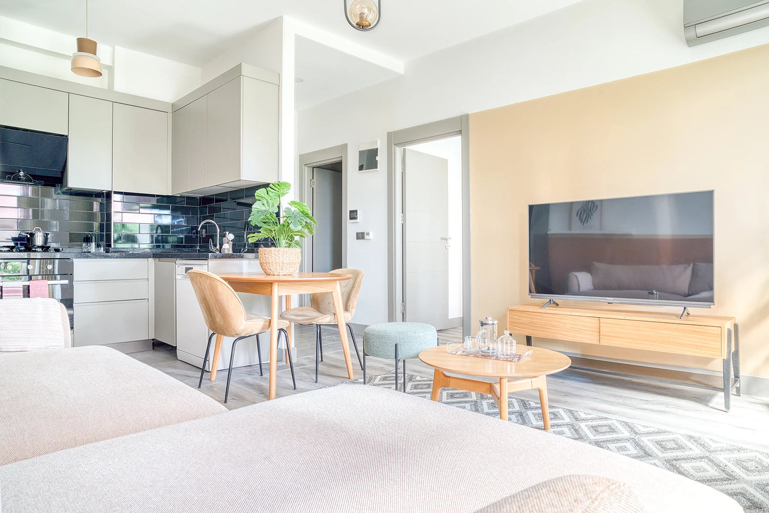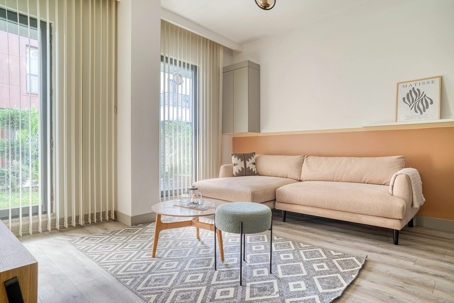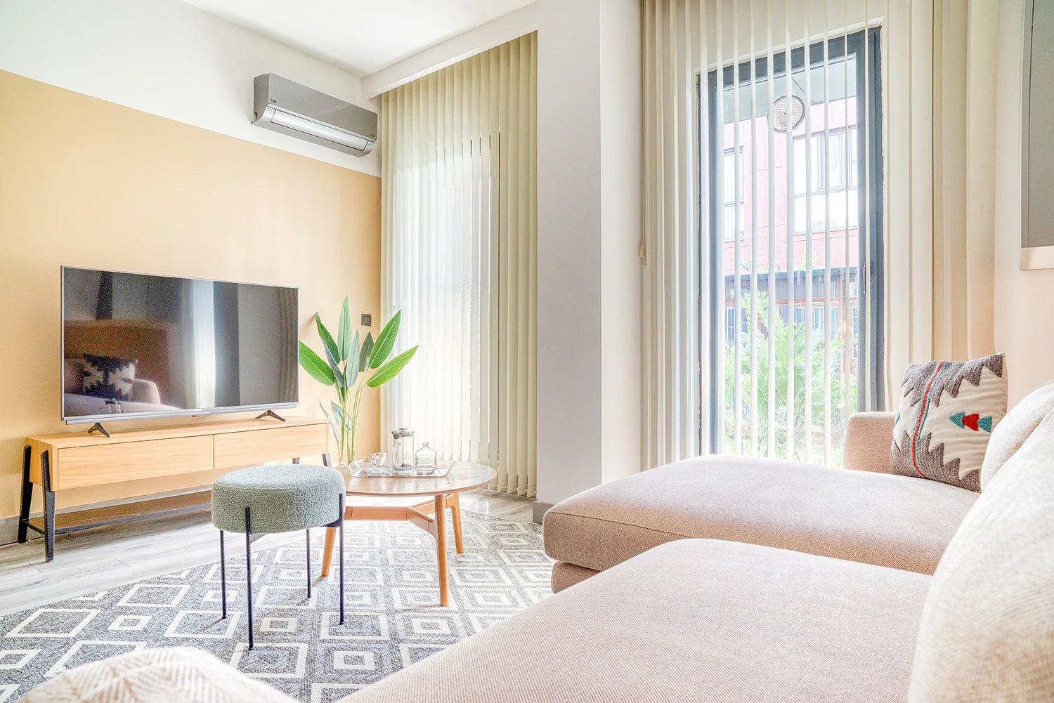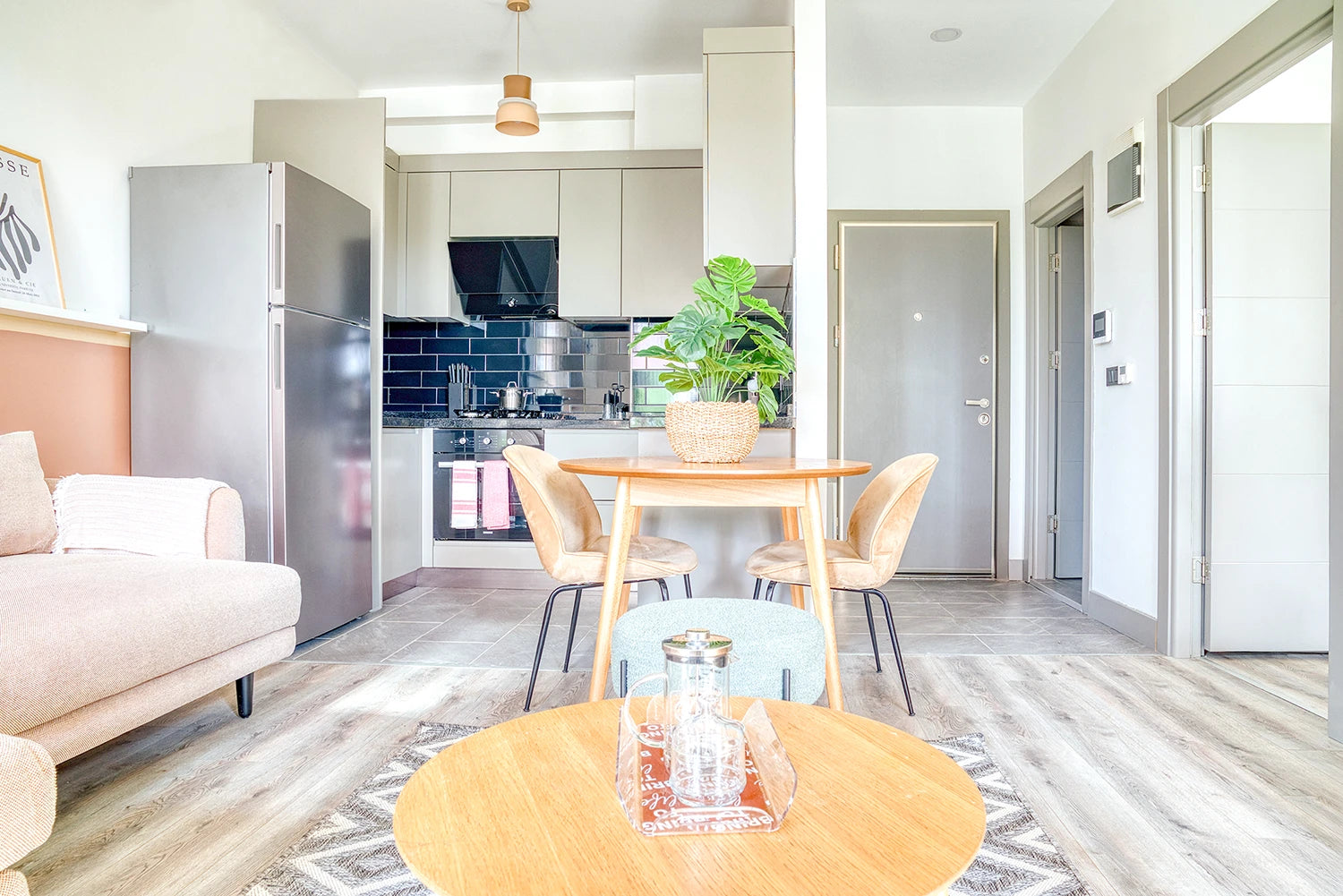 918 numarada bulunan bu 36,0 m²'lik daire, kompakt bir alanda özenle tasarlanmış bir yaşam alanı sunmaktadır. Tek katlı dairede bir yatak odası, bir banyo ve bir oturma odası bulunmaktadır ve her alan maksimum verimlilik için özenle planlanmıştır. Blend+R markasının doğa dostu ve sürdürülebilir ürünleri de kullanılarak dizayn edilen evimizde, oturma odası, evin kalbi olarak işlev görür ve ahşap konsolun üzerine monte edilmiş büyük bir düz ekran TV'nin bulunduğu şık bir eğlence merkezi ile donatılmıştır. Alan, rahat bir köşe kanepe, yuvarlak bir sehpa ve ahşap görünümlü zemine görsel bir ilgi katan desenli bir halı ile süslenmiştir. Dikey panjurlu büyük pencereler, bol miktarda doğal ışık ve çevredeki yeşilliğin manzarasını sunar. 11,0 m² büyüklüğündeki yatak odası, çift kişilik yatak, aynalı kapaklı gömme dolaplar ve komodin ile rahat bir dinlenme alanıdır. Tavandaki sarkıt lamba odaya sıcaklık katarken, bir başka büyük pencere doğal aydınlatma ve dış mekan manzarası sunar. Banyo, kompakt olmasına rağmen modern armatürlerle verimli bir şekilde tasarlanmıştır. Duvara monte tuvalet, cam kaplı duş ve çamaşır makinesi ile mevcut alanın akıllıca kullanıldığını gösterir. Dairenin genelinde, bej duvarlar ve sıcak ahşap tonları uyumlu bir atmosfer yaratarak nötr ve sakin bir renk paleti oluşturur. Saksı bitkileri, iç mekana doğanın dokunuşunu getirerek genel ambiyansı zenginleştirir. Klima üniteleri yıl boyunca konfor sağlarken, mobilyaların ve ev aletlerinin stratejik yerleşimi, bu iyi donanımlı küçük dairenin işlevselliğini en üst düzeye çıkarır.