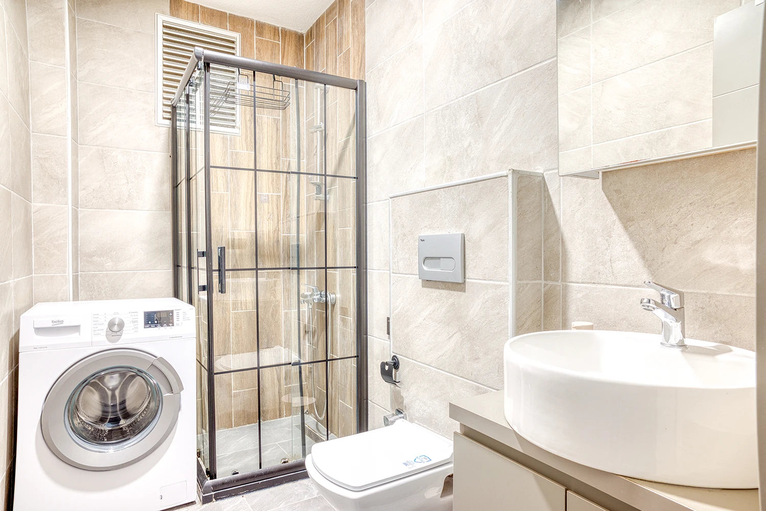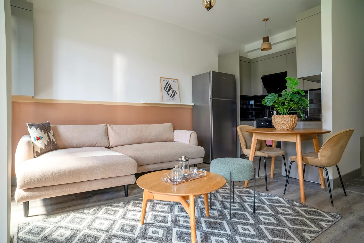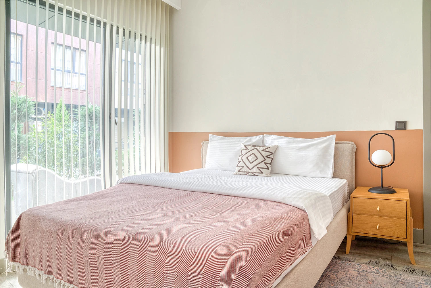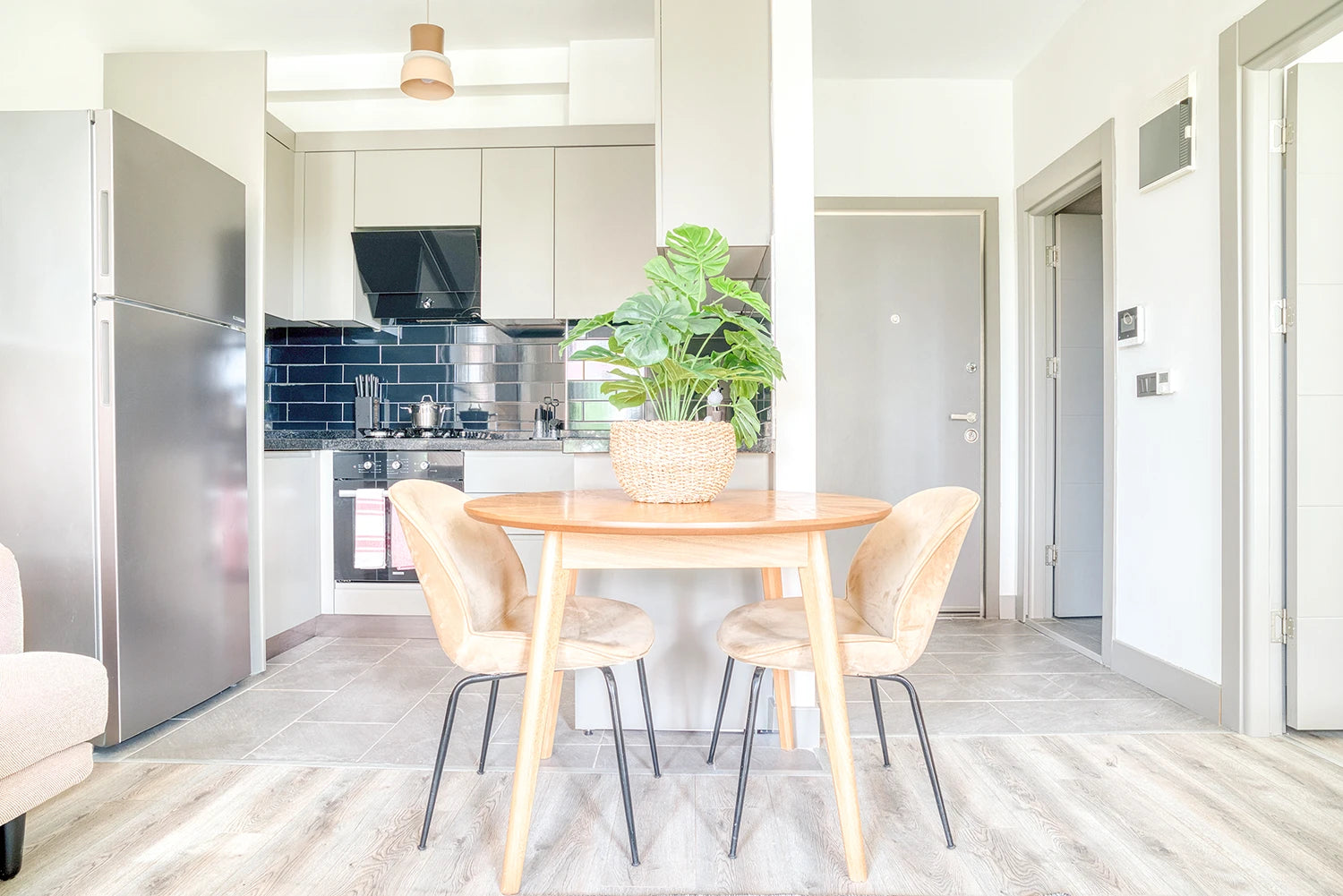 918 numarada bulunan bu 36,0 m²'lik daire, kompakt bir alanda özenle tasarlanmış bir yaşam alanı sunmaktadır. Tek katlı dairede bir yatak odası, bir banyo ve bir oturma odası bulunmaktadır ve her alan maksimum verimlilik için özenle planlanmıştır. Blend+R markasının doğa dostu ve sürdürülebilir ürünleri de kullanılarak dizayn edilen evimizde, oturma odası, evin kalbi olarak işlev görür ve ahşap konsolun üzerine monte edilmiş büyük bir düz ekran TV'nin bulunduğu şık bir eğlence merkezi ile donatılmıştır. Alan, rahat bir köşe kanepe, yuvarlak bir sehpa ve ahşap görünümlü zemine görsel bir ilgi katan desenli bir halı ile süslenmiştir. Dikey panjurlu büyük pencereler, bol miktarda doğal ışık ve çevredeki yeşilliğin manzarasını sunar. 11,0 m² büyüklüğündeki yatak odası, çift kişilik yatak, aynalı kapaklı gömme dolaplar ve komodin ile rahat bir dinlenme alanıdır. Tavandaki sarkıt lamba odaya sıcaklık katarken, bir başka büyük pencere doğal aydınlatma ve dış mekan manzarası sunar. Banyo, kompakt olmasına rağmen modern armatürlerle verimli bir şekilde tasarlanmıştır. Duvara monte tuvalet, cam kaplı duş ve çamaşır makinesi ile mevcut alanın akıllıca kullanıldığını gösterir. Dairenin genelinde, bej duvarlar ve sıcak ahşap tonları uyumlu bir atmosfer yaratarak nötr ve sakin bir renk paleti oluşturur. Saksı bitkileri, iç mekana doğanın dokunuşunu getirerek genel ambiyansı zenginleştirir. Klima üniteleri yıl boyunca konfor sağlarken, mobilyaların ve ev aletlerinin stratejik yerleşimi, bu iyi donanımlı küçük dairenin işlevselliğini en üst düzeye çıkarır.