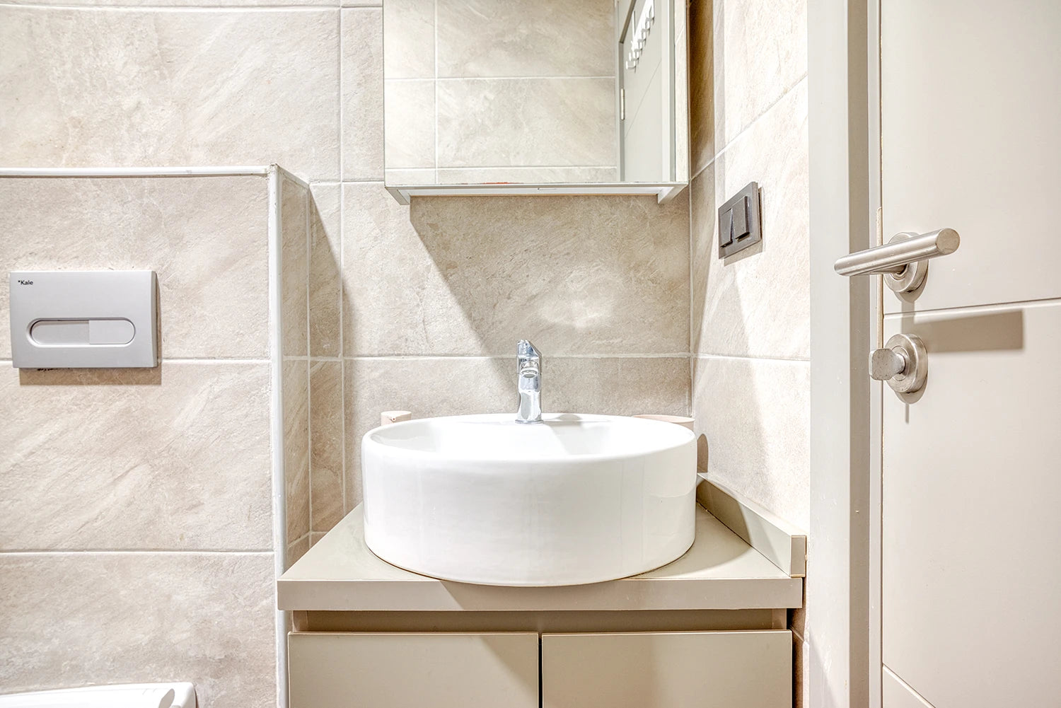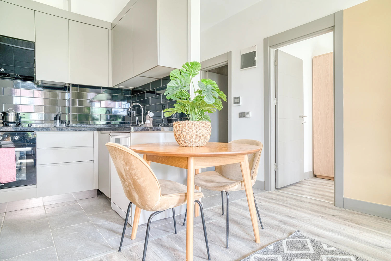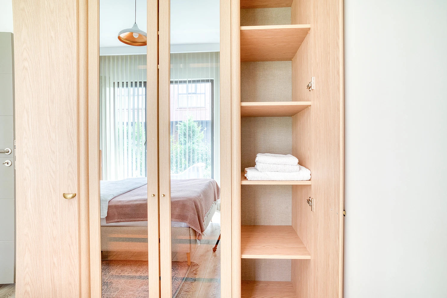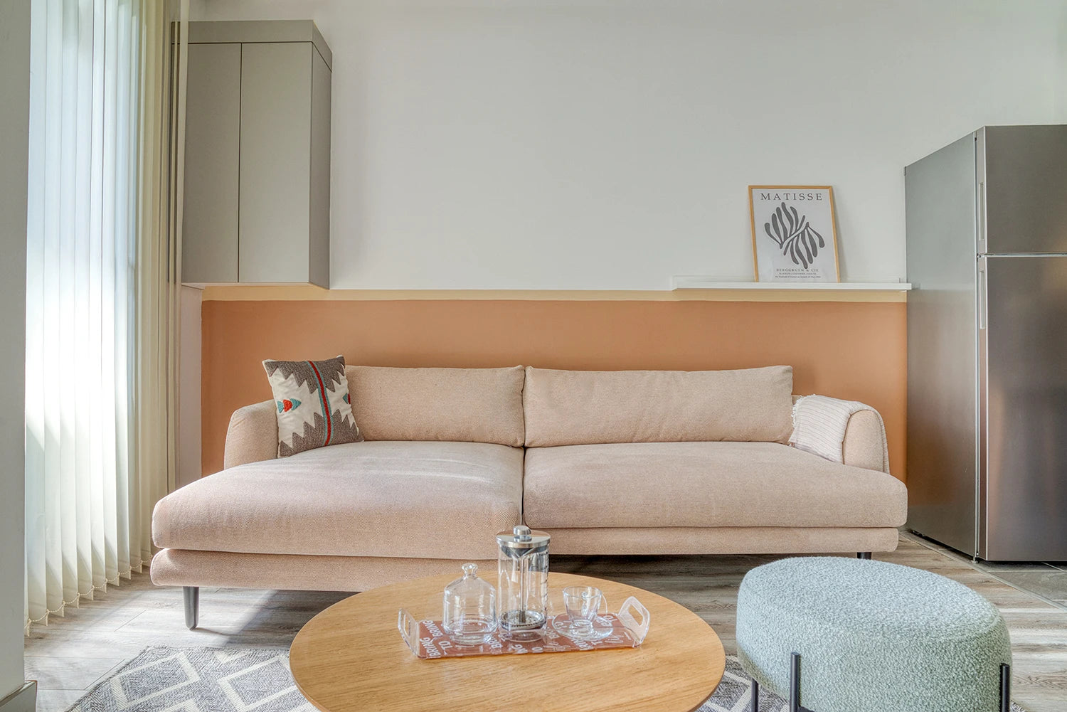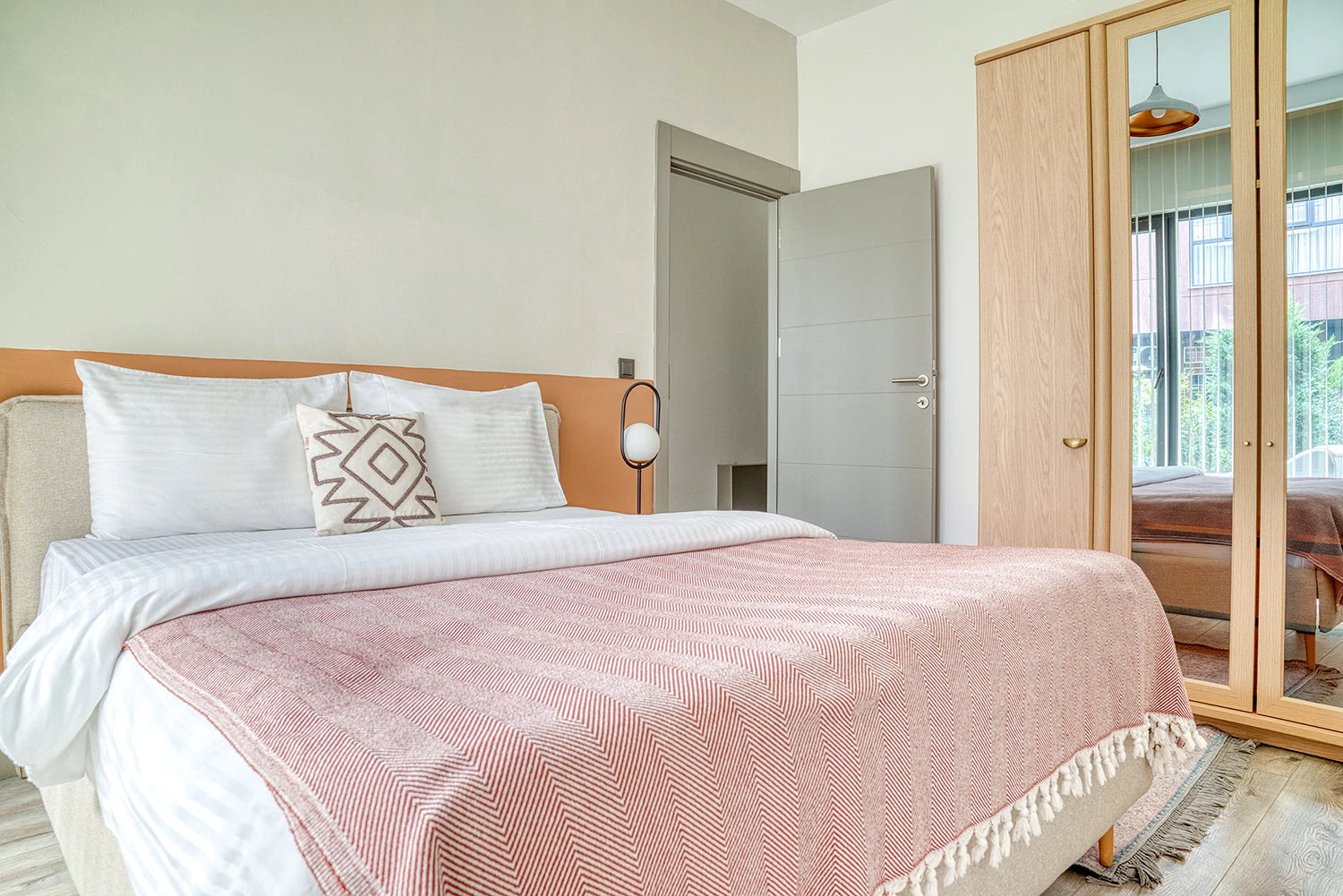 918 numarada bulunan bu 36,0 m²'lik daire, kompakt bir alanda özenle tasarlanmış bir yaşam alanı sunmaktadır. Tek katlı dairede bir yatak odası, bir banyo ve bir oturma odası bulunmaktadır ve her alan maksimum verimlilik için özenle planlanmıştır. Blend+R markasının doğa dostu ve sürdürülebilir ürünleri de kullanılarak dizayn edilen evimizde, oturma odası, evin kalbi olarak işlev görür ve ahşap konsolun üzerine monte edilmiş büyük bir düz ekran TV'nin bulunduğu şık bir eğlence merkezi ile donatılmıştır. Alan, rahat bir köşe kanepe, yuvarlak bir sehpa ve ahşap görünümlü zemine görsel bir ilgi katan desenli bir halı ile süslenmiştir. Dikey panjurlu büyük pencereler, bol miktarda doğal ışık ve çevredeki yeşilliğin manzarasını sunar. 11,0 m² büyüklüğündeki yatak odası, çift kişilik yatak, aynalı kapaklı gömme dolaplar ve komodin ile rahat bir dinlenme alanıdır. Tavandaki sarkıt lamba odaya sıcaklık katarken, bir başka büyük pencere doğal aydınlatma ve dış mekan manzarası sunar. Banyo, kompakt olmasına rağmen modern armatürlerle verimli bir şekilde tasarlanmıştır. Duvara monte tuvalet, cam kaplı duş ve çamaşır makinesi ile mevcut alanın akıllıca kullanıldığını gösterir. Dairenin genelinde, bej duvarlar ve sıcak ahşap tonları uyumlu bir atmosfer yaratarak nötr ve sakin bir renk paleti oluşturur. Saksı bitkileri, iç mekana doğanın dokunuşunu getirerek genel ambiyansı zenginleştirir. Klima üniteleri yıl boyunca konfor sağlarken, mobilyaların ve ev aletlerinin stratejik yerleşimi, bu iyi donanımlı küçük dairenin işlevselliğini en üst düzeye çıkarır.