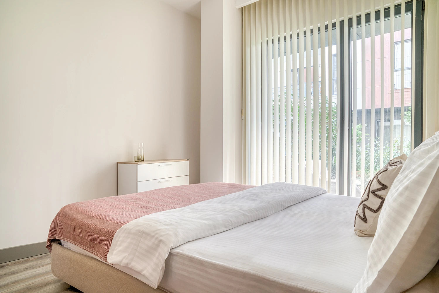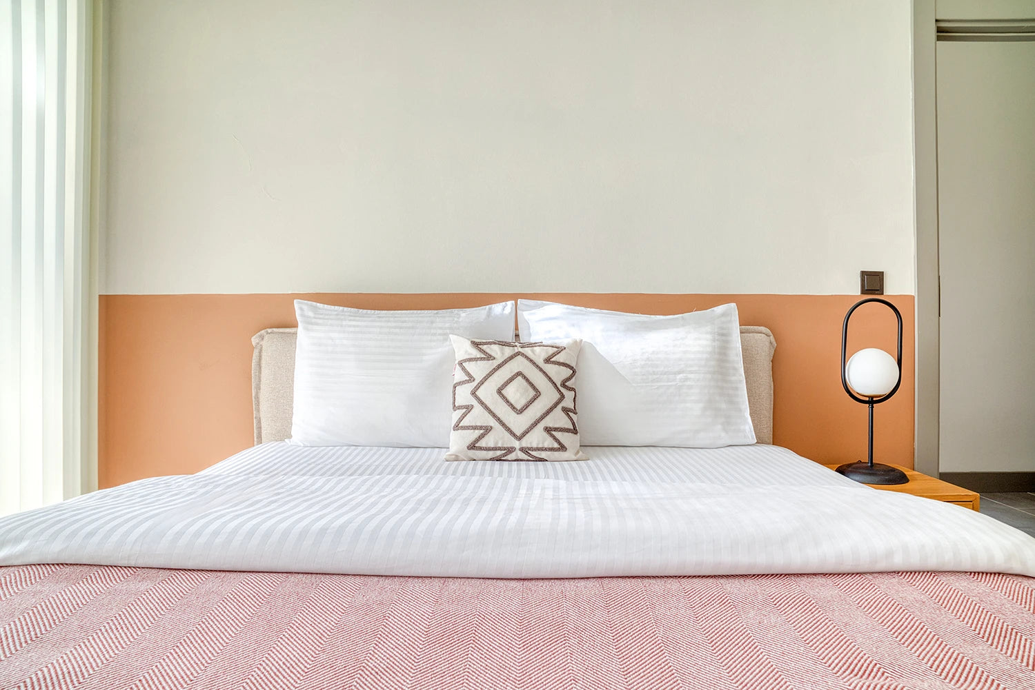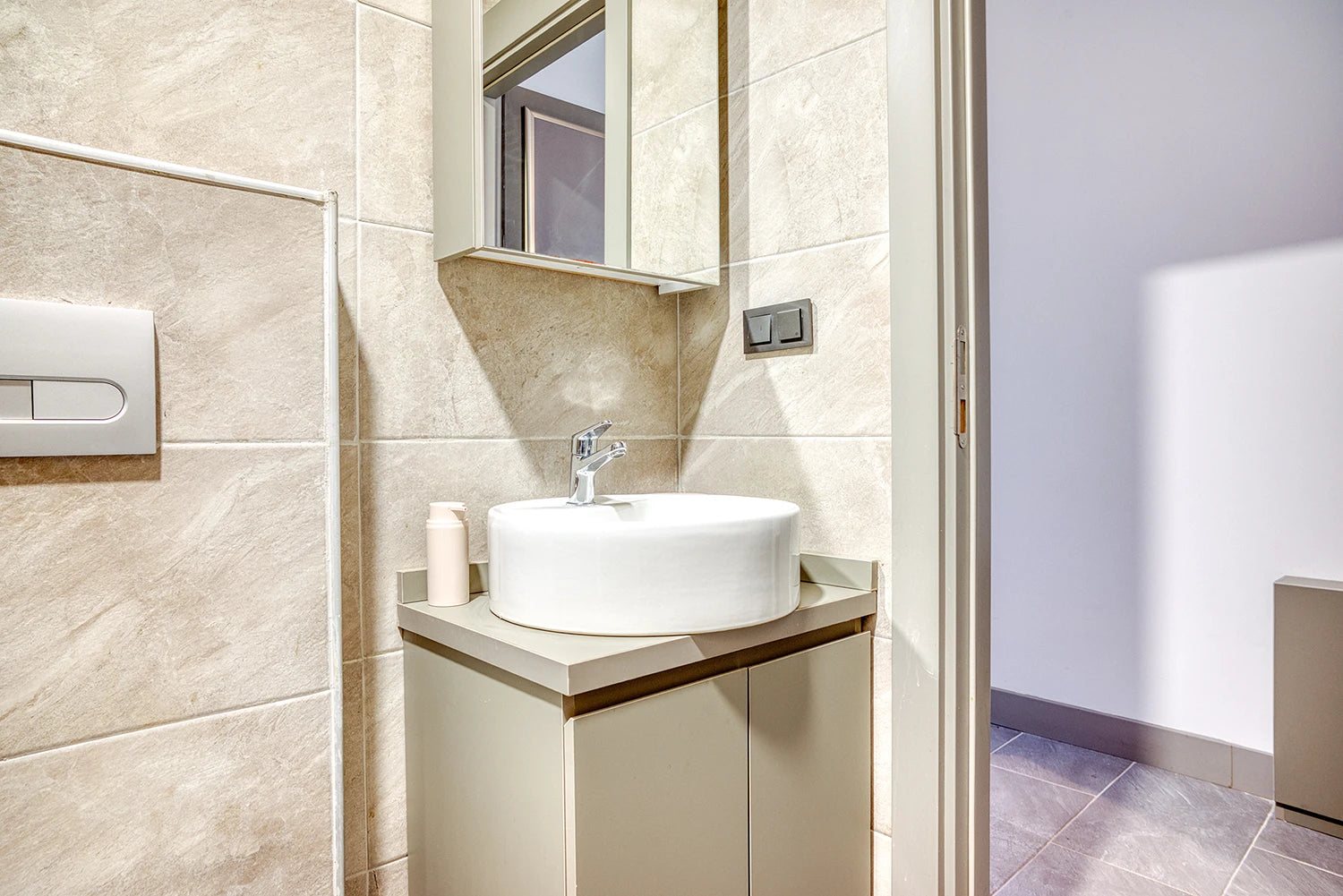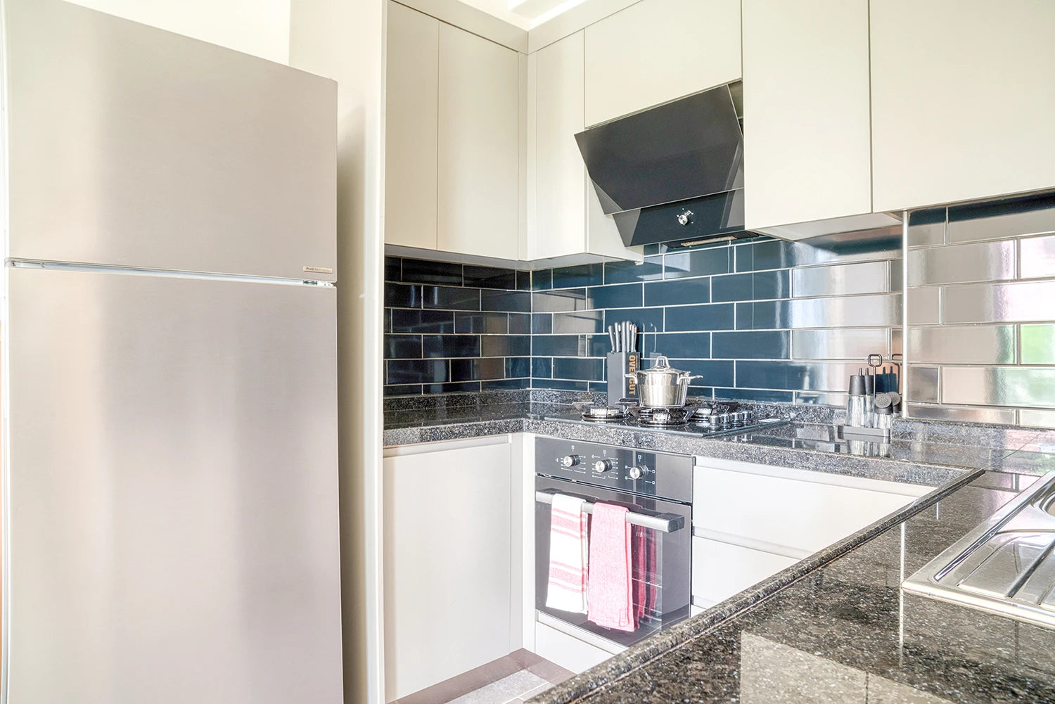 918 numarada bulunan bu 36,0 m²'lik daire, kompakt bir alanda özenle tasarlanmış bir yaşam alanı sunmaktadır. Tek katlı dairede bir yatak odası, bir banyo ve bir oturma odası bulunmaktadır ve her alan maksimum verimlilik için özenle planlanmıştır. Blend+R markasının doğa dostu ve sürdürülebilir ürünleri de kullanılarak dizayn edilen evimizde, oturma odası, evin kalbi olarak işlev görür ve ahşap konsolun üzerine monte edilmiş büyük bir düz ekran TV'nin bulunduğu şık bir eğlence merkezi ile donatılmıştır. Alan, rahat bir köşe kanepe, yuvarlak bir sehpa ve ahşap görünümlü zemine görsel bir ilgi katan desenli bir halı ile süslenmiştir. Dikey panjurlu büyük pencereler, bol miktarda doğal ışık ve çevredeki yeşilliğin manzarasını sunar. 11,0 m² büyüklüğündeki yatak odası, çift kişilik yatak, aynalı kapaklı gömme dolaplar ve komodin ile rahat bir dinlenme alanıdır. Tavandaki sarkıt lamba odaya sıcaklık katarken, bir başka büyük pencere doğal aydınlatma ve dış mekan manzarası sunar. Banyo, kompakt olmasına rağmen modern armatürlerle verimli bir şekilde tasarlanmıştır. Duvara monte tuvalet, cam kaplı duş ve çamaşır makinesi ile mevcut alanın akıllıca kullanıldığını gösterir. Dairenin genelinde, bej duvarlar ve sıcak ahşap tonları uyumlu bir atmosfer yaratarak nötr ve sakin bir renk paleti oluşturur. Saksı bitkileri, iç mekana doğanın dokunuşunu getirerek genel ambiyansı zenginleştirir. Klima üniteleri yıl boyunca konfor sağlarken, mobilyaların ve ev aletlerinin stratejik yerleşimi, bu iyi donanımlı küçük dairenin işlevselliğini en üst düzeye çıkarır.