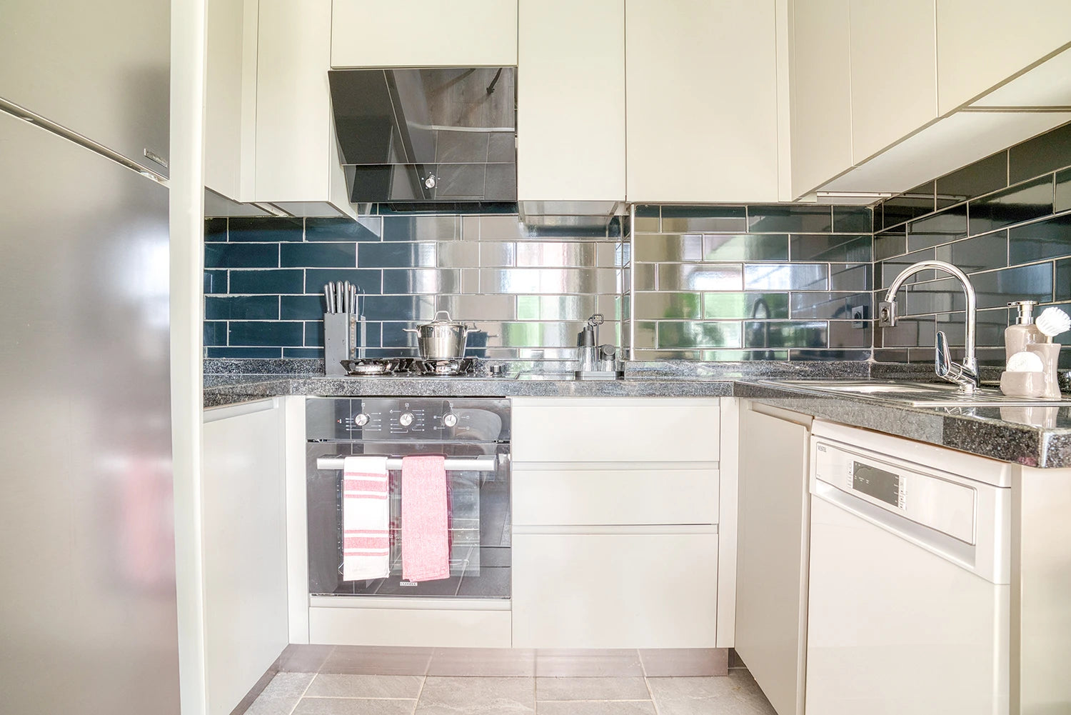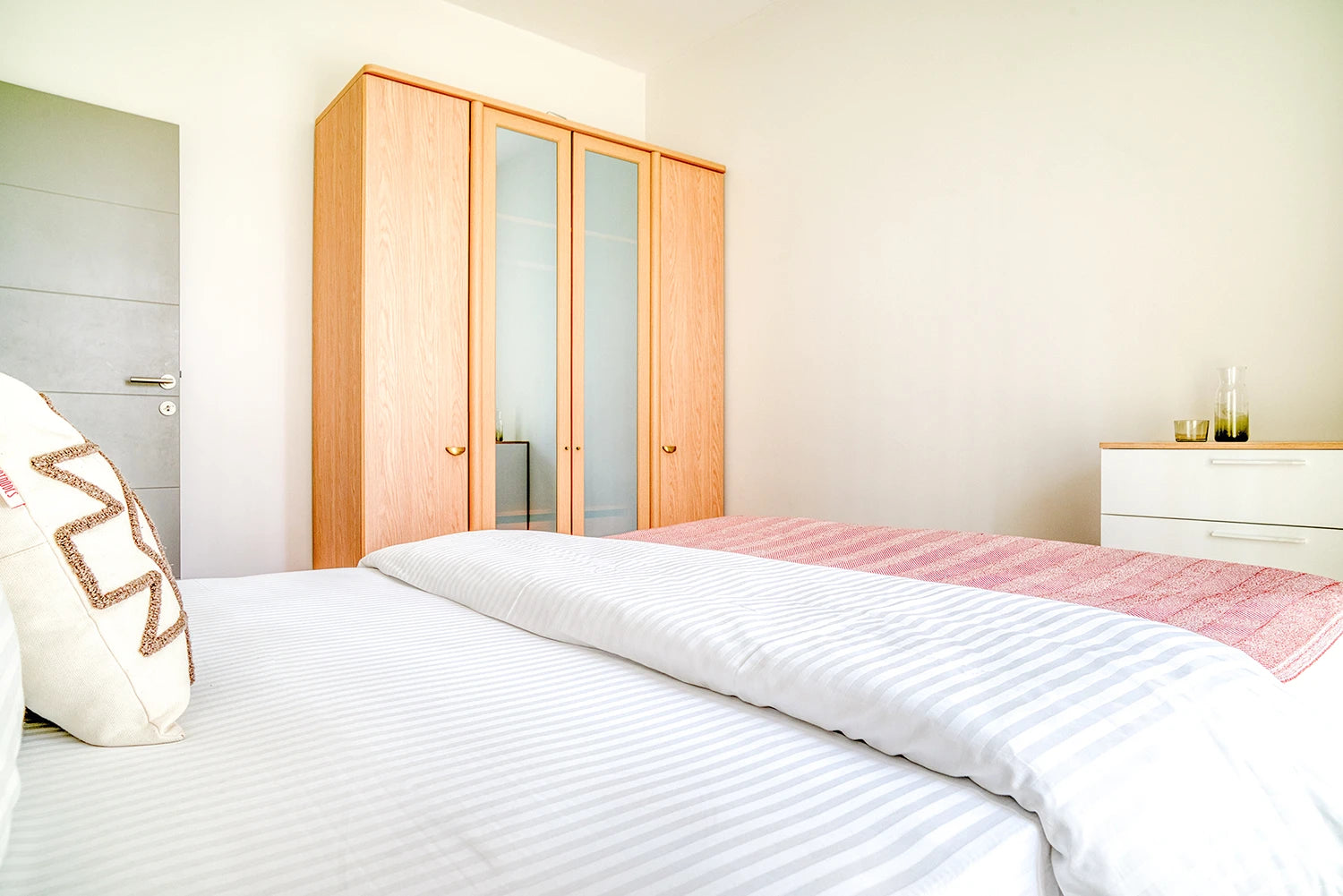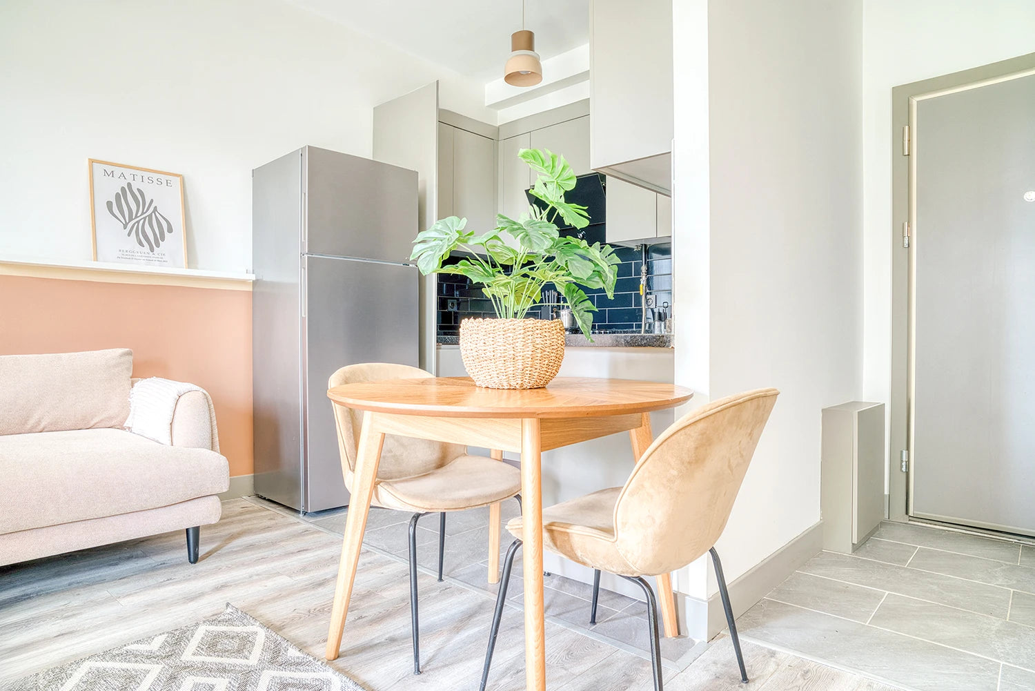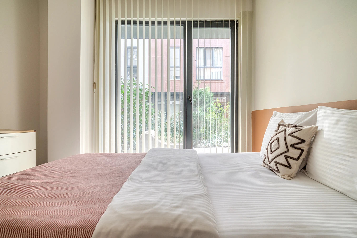 918 numarada bulunan bu 36,0 m²'lik daire, kompakt bir alanda özenle tasarlanmış bir yaşam alanı sunmaktadır. Tek katlı dairede bir yatak odası, bir banyo ve bir oturma odası bulunmaktadır ve her alan maksimum verimlilik için özenle planlanmıştır. Blend+R markasının doğa dostu ve sürdürülebilir ürünleri de kullanılarak dizayn edilen evimizde, oturma odası, evin kalbi olarak işlev görür ve ahşap konsolun üzerine monte edilmiş büyük bir düz ekran TV'nin bulunduğu şık bir eğlence merkezi ile donatılmıştır. Alan, rahat bir köşe kanepe, yuvarlak bir sehpa ve ahşap görünümlü zemine görsel bir ilgi katan desenli bir halı ile süslenmiştir. Dikey panjurlu büyük pencereler, bol miktarda doğal ışık ve çevredeki yeşilliğin manzarasını sunar. 11,0 m² büyüklüğündeki yatak odası, çift kişilik yatak, aynalı kapaklı gömme dolaplar ve komodin ile rahat bir dinlenme alanıdır. Tavandaki sarkıt lamba odaya sıcaklık katarken, bir başka büyük pencere doğal aydınlatma ve dış mekan manzarası sunar. Banyo, kompakt olmasına rağmen modern armatürlerle verimli bir şekilde tasarlanmıştır. Duvara monte tuvalet, cam kaplı duş ve çamaşır makinesi ile mevcut alanın akıllıca kullanıldığını gösterir. Dairenin genelinde, bej duvarlar ve sıcak ahşap tonları uyumlu bir atmosfer yaratarak nötr ve sakin bir renk paleti oluşturur. Saksı bitkileri, iç mekana doğanın dokunuşunu getirerek genel ambiyansı zenginleştirir. Klima üniteleri yıl boyunca konfor sağlarken, mobilyaların ve ev aletlerinin stratejik yerleşimi, bu iyi donanımlı küçük dairenin işlevselliğini en üst düzeye çıkarır.